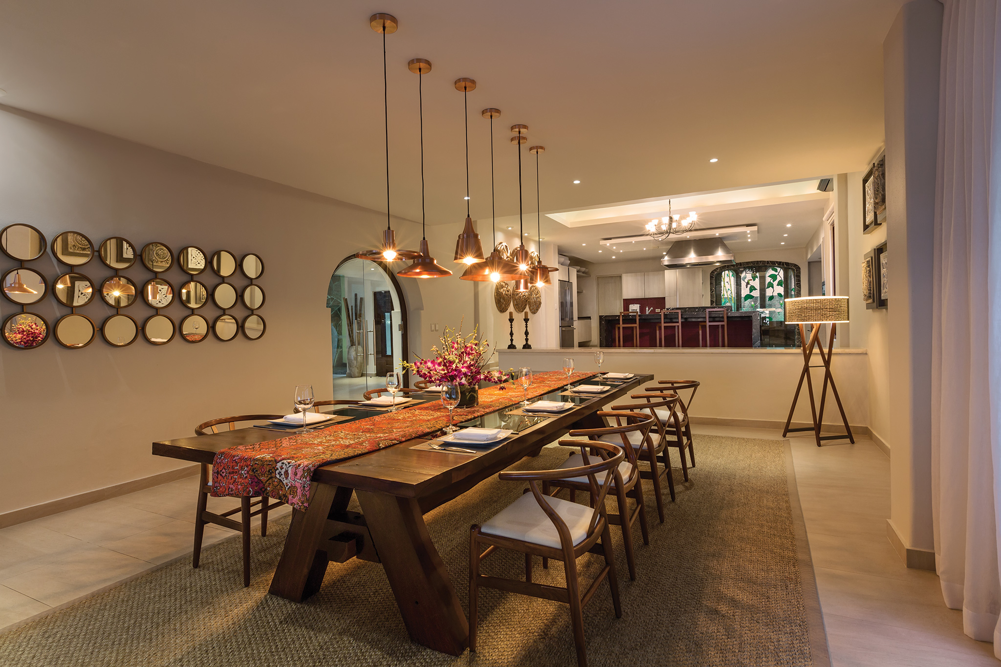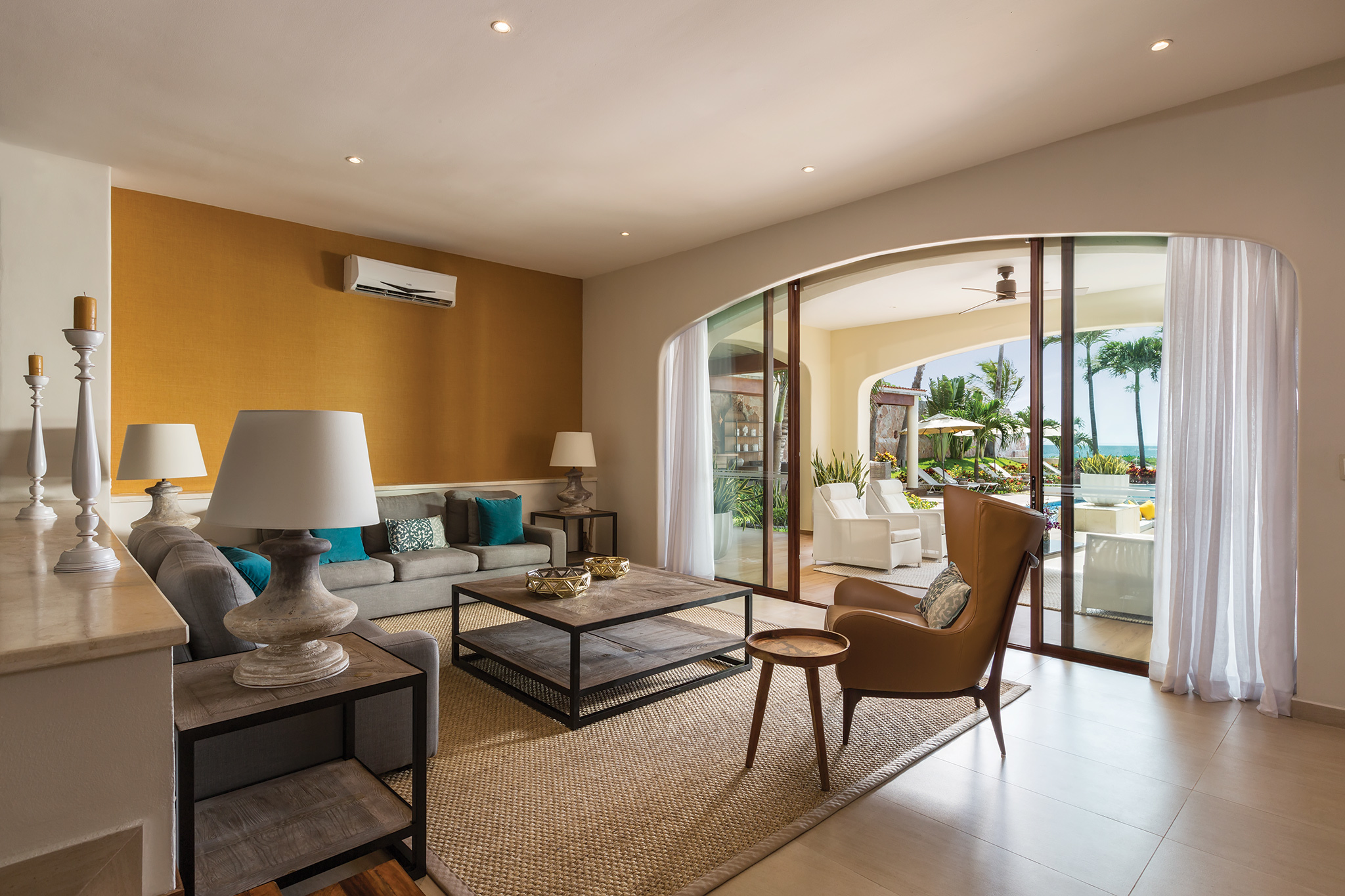 The living room, dining room, and entertaining areas open toward the spacious outdoors and provide magnificent views of the turquoise Mexican-Caribbean Sea.
